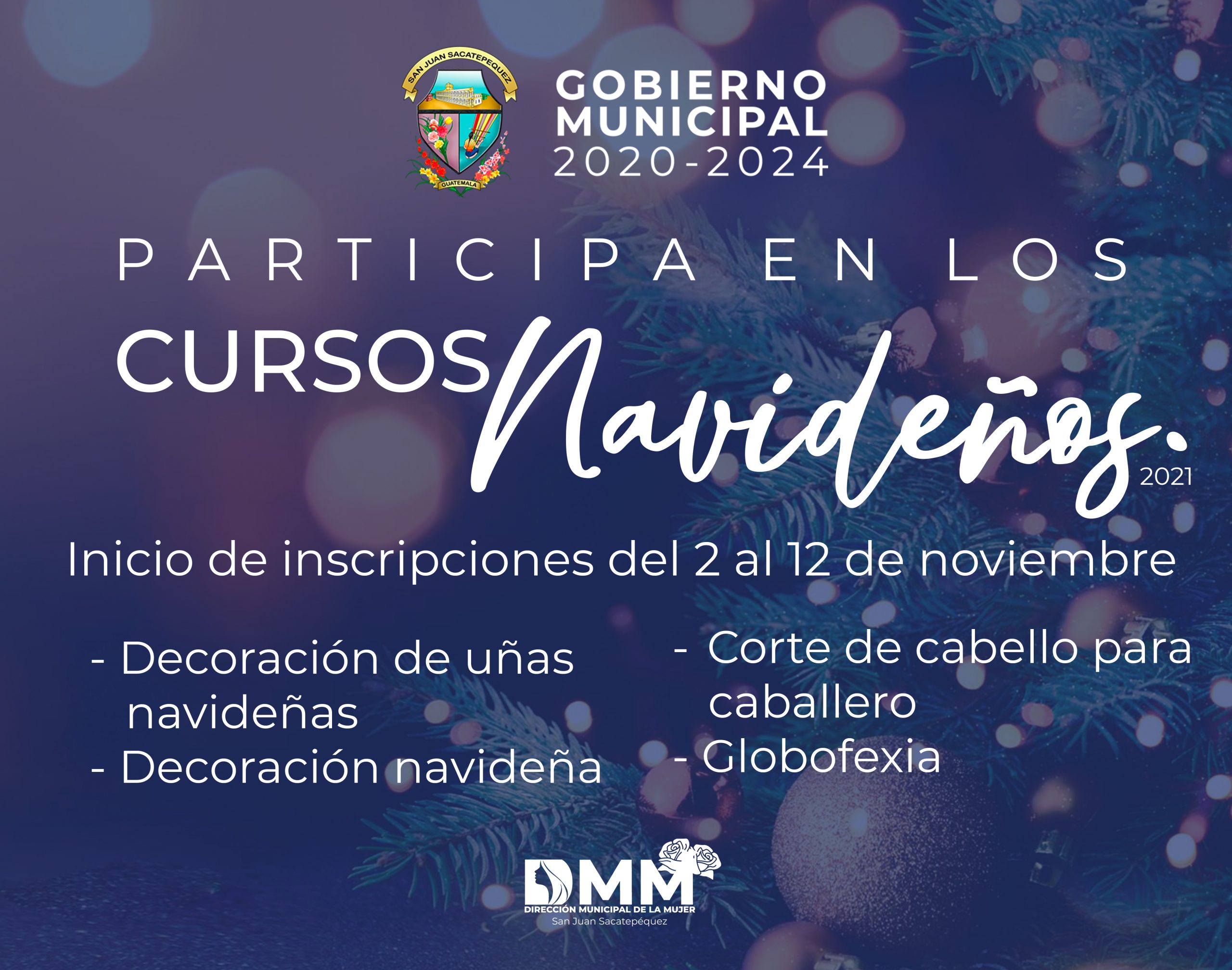 | 2 pm a 4 pm | Belleza (corte de cabello caballero) – PRESENCIAL – Oficina DMM: 6.ª calle, 7-17, zona 2 | Decoración uñas motivo navideño – PRESENCIAL – Oficina DMM: 6.ª calle, 7-17, zona 2 |