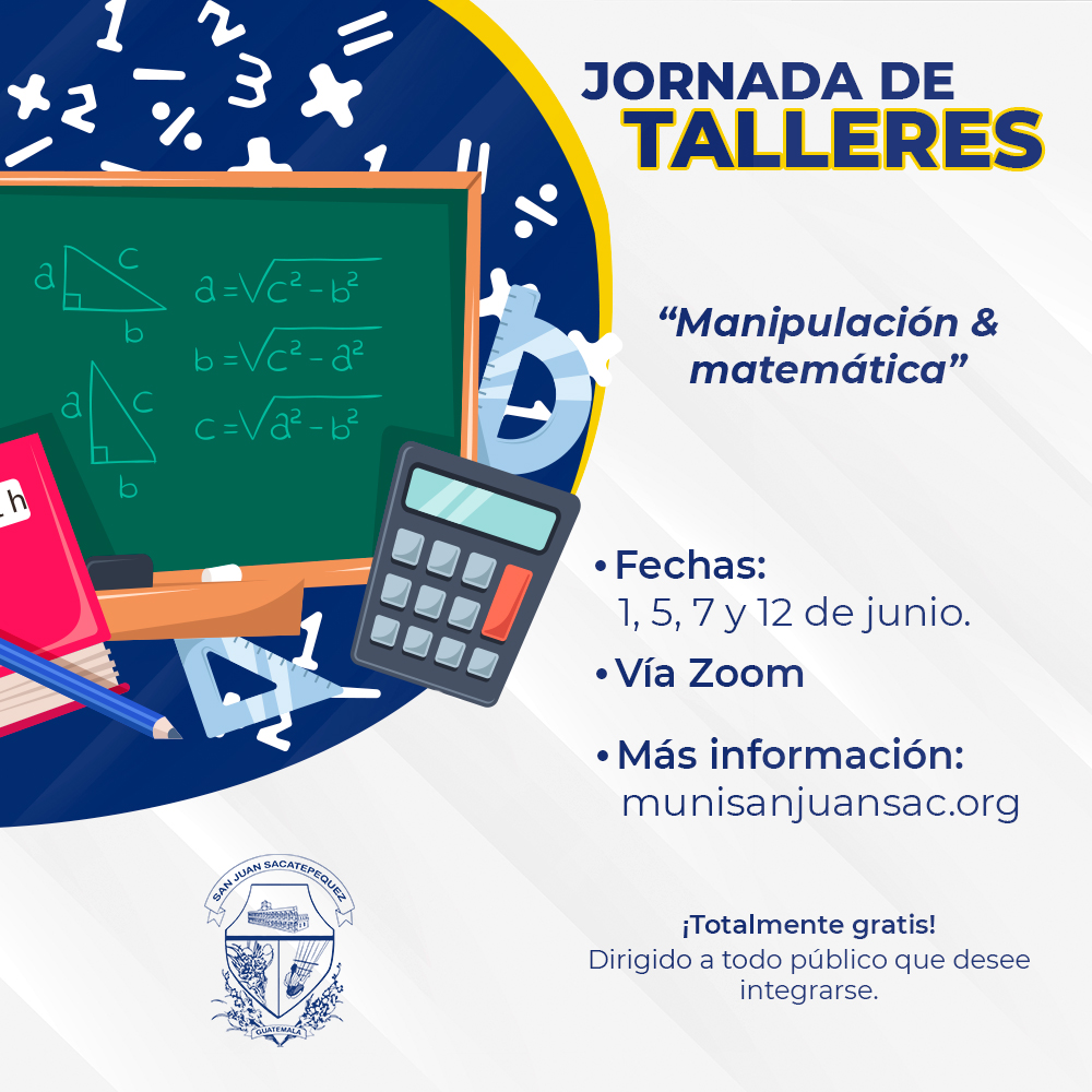 La Municipalidad de San Juan Sacatepéquez a través de la Dirección Municipal de Educación y la Jefatura de Didáctica Pedagógica en coordinación con el Club de Matemática Educativo invitan a la población sanjuanera a jornada de talleres que se impartirán vía Zoom. Cupo limitado sin proceso de inscripción, únicamente deben ingresar puntualmente a la sesión del día, se dará diploma a los que asistan a los 4 talleres.