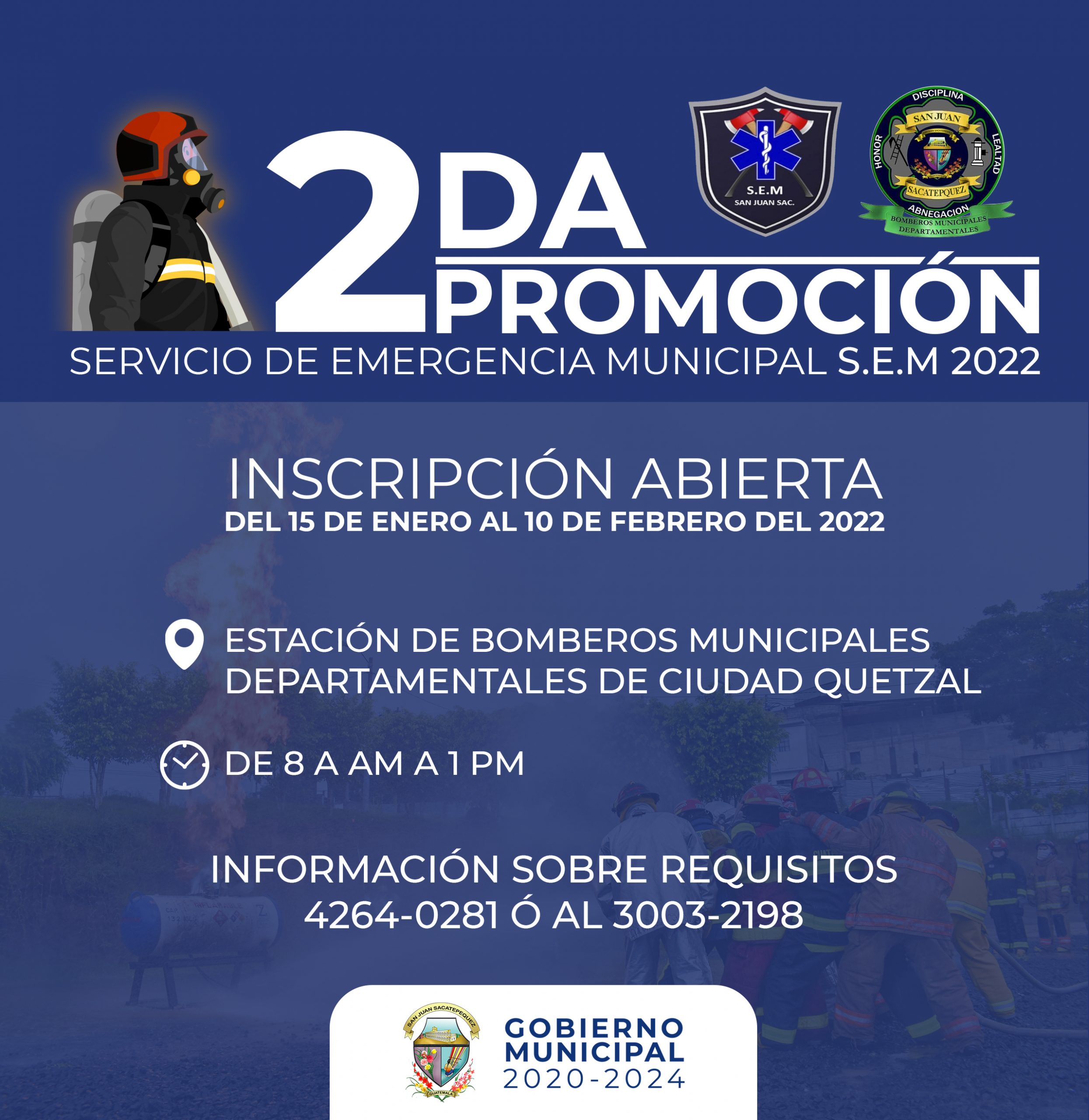 La Estación De Bomberos Municipales Departamentales De Ciudad Quetzal invitan a la población entre 18 a 40 años a formar parte de la Segunda Promoción de Servicio de Emergencias Municipal -SEM-.